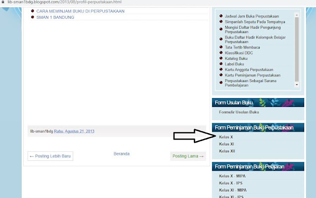 - Pilih menu Form Peminjaman Buku Perpustakaan, kemudian pilih Kelas yg sesuai dengan kelas saat ini