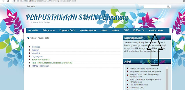 ·Buka website perpustakaan http://info.lib.sman1bdg.sch.id lalu pilih Katalog Online atau bisa juga buka website http://lib.sman1bdg.sch.id/katalog untuk bisa langsung memilih buku.